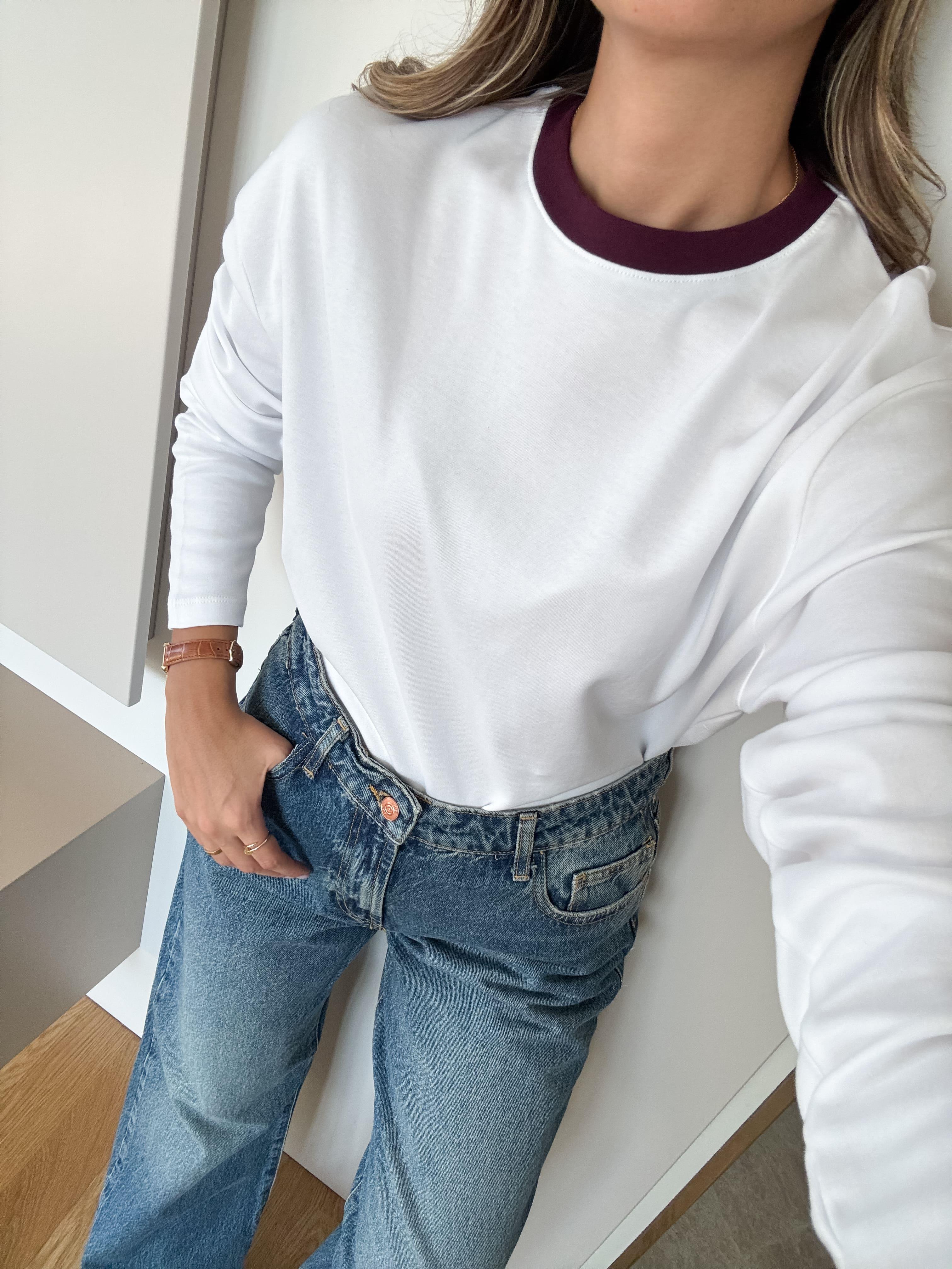 Beyaz Yakası Bordo Biyeli Pamuklu Bluz