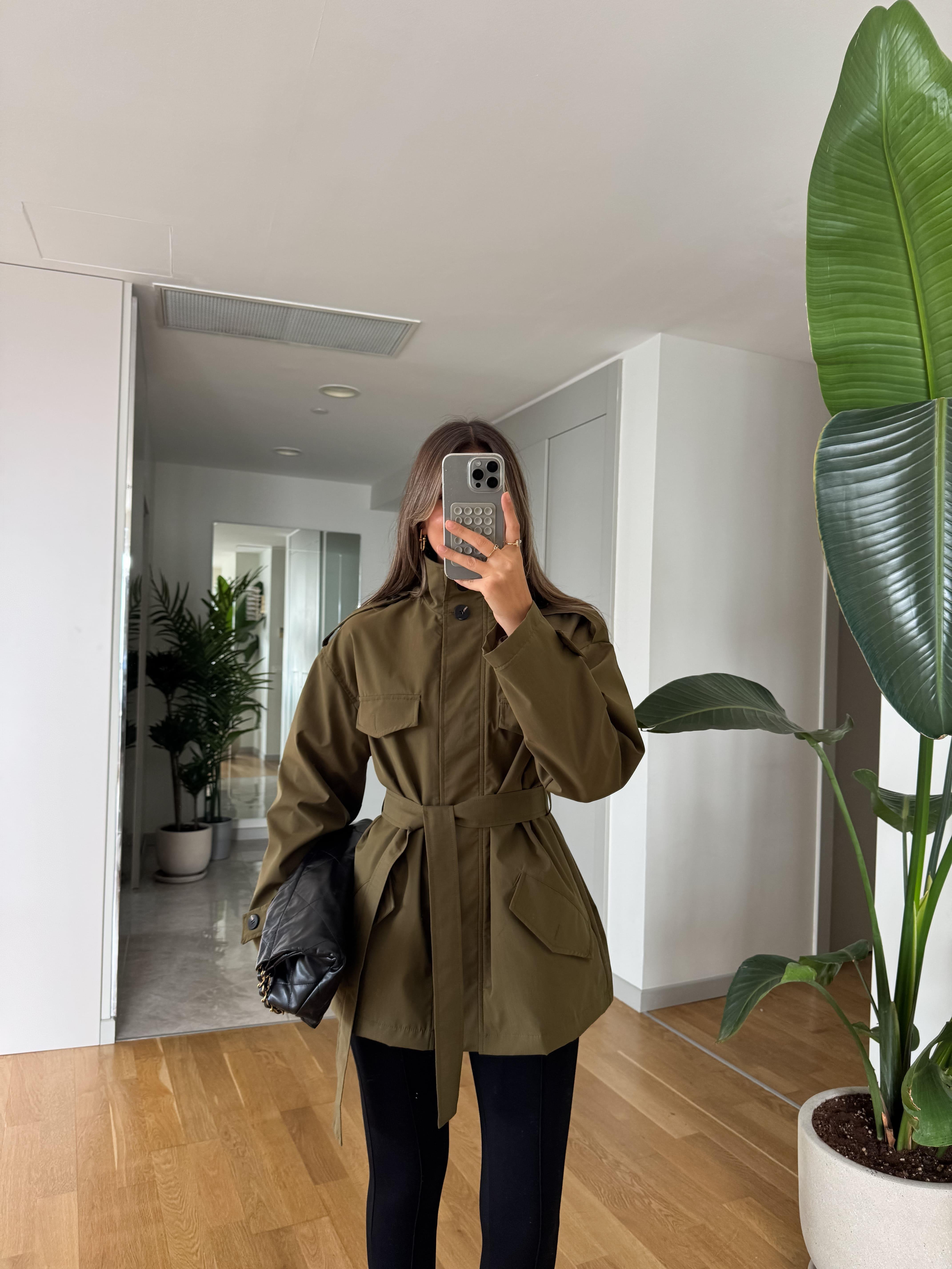 Dik Yaka Kuşaklı Trençkot -Yağ Yeşili