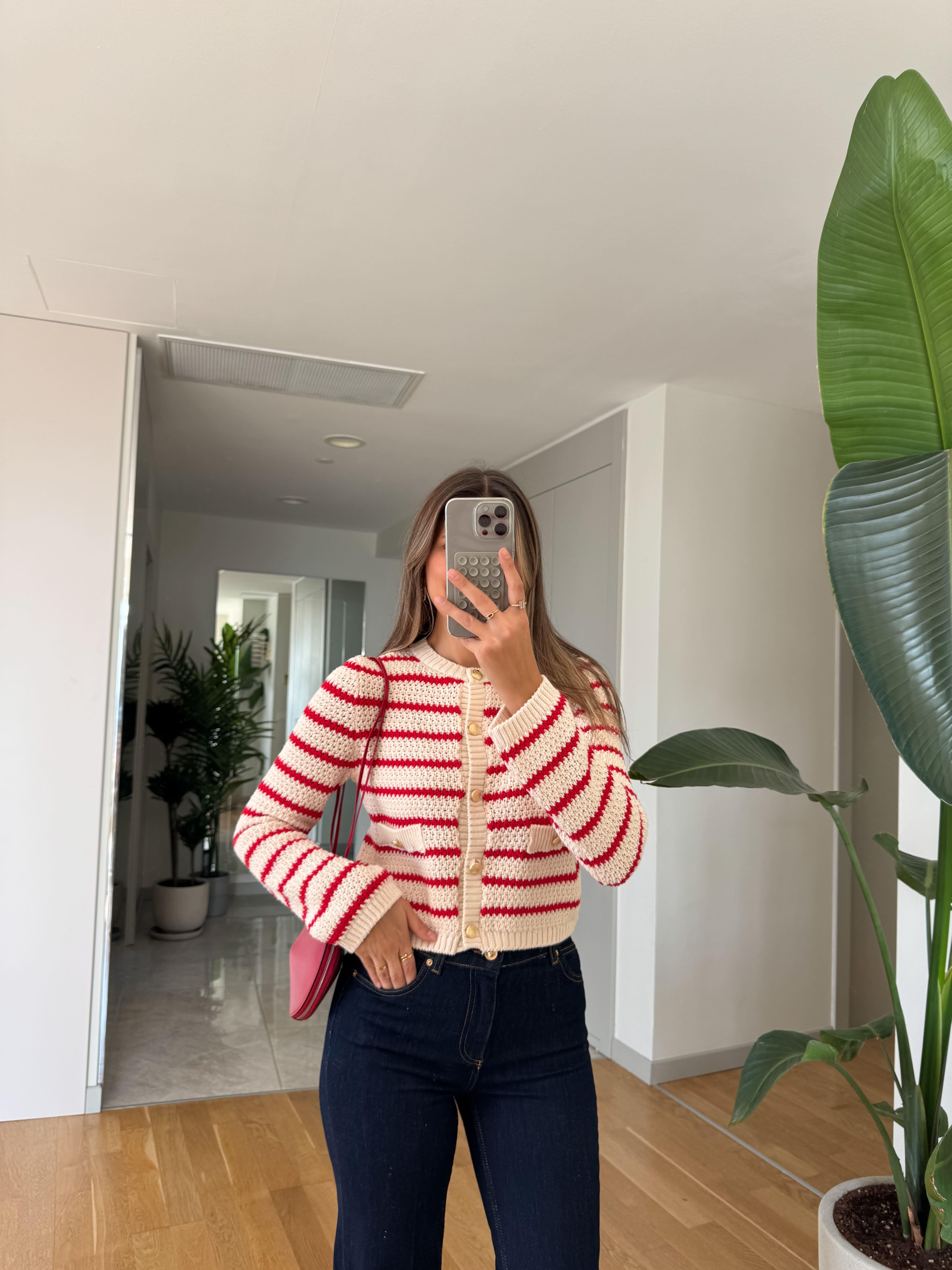 Kırmızı Çizgili Gold Düğmeli Hırka (KRMZ-CZGL-GLD-DGML-HRK)