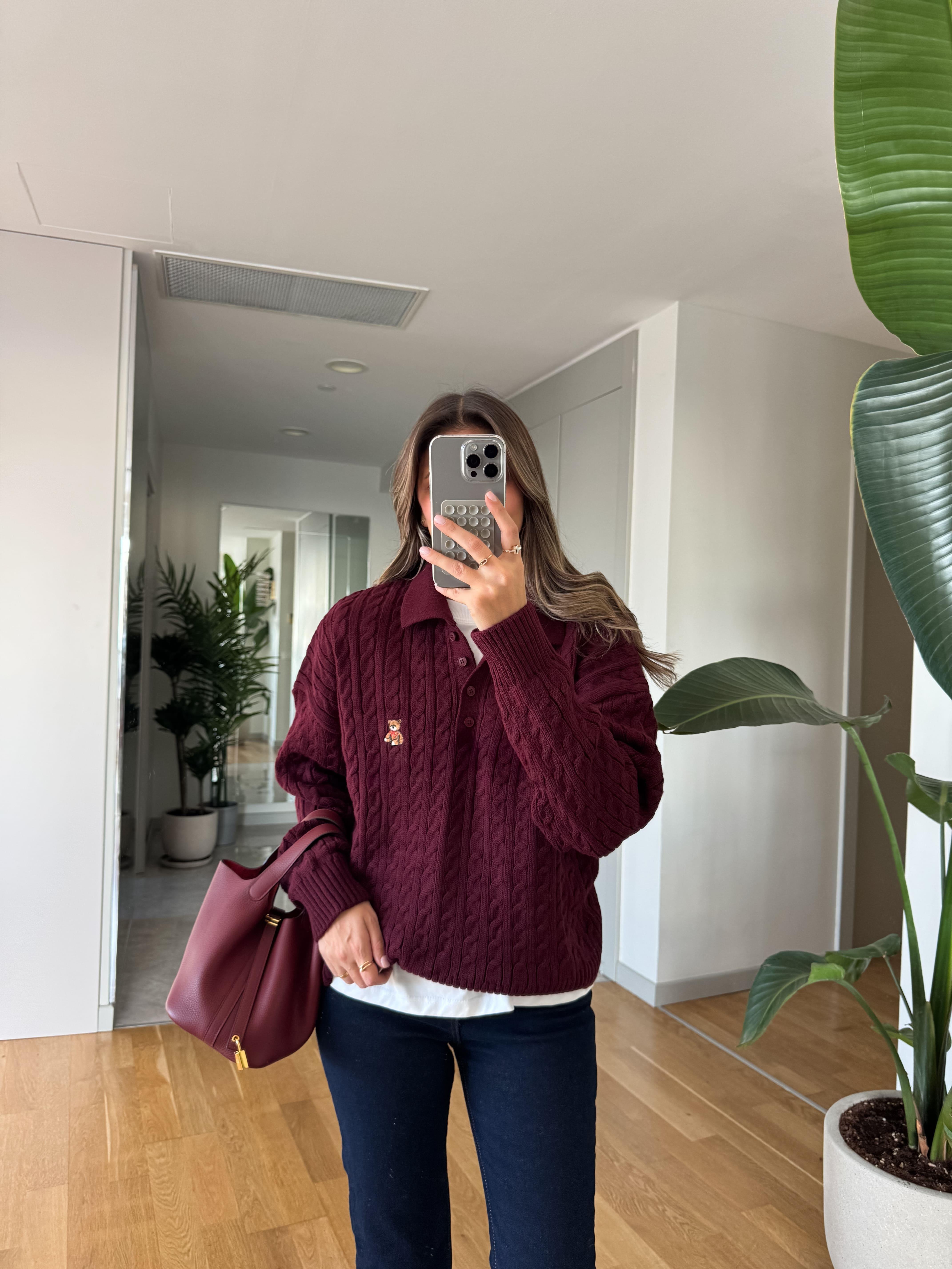Polo Yaka Ayıcık Nakışlı Kazak - Bordo (PL-YK-YCK-NKSL-KZK-BRD)