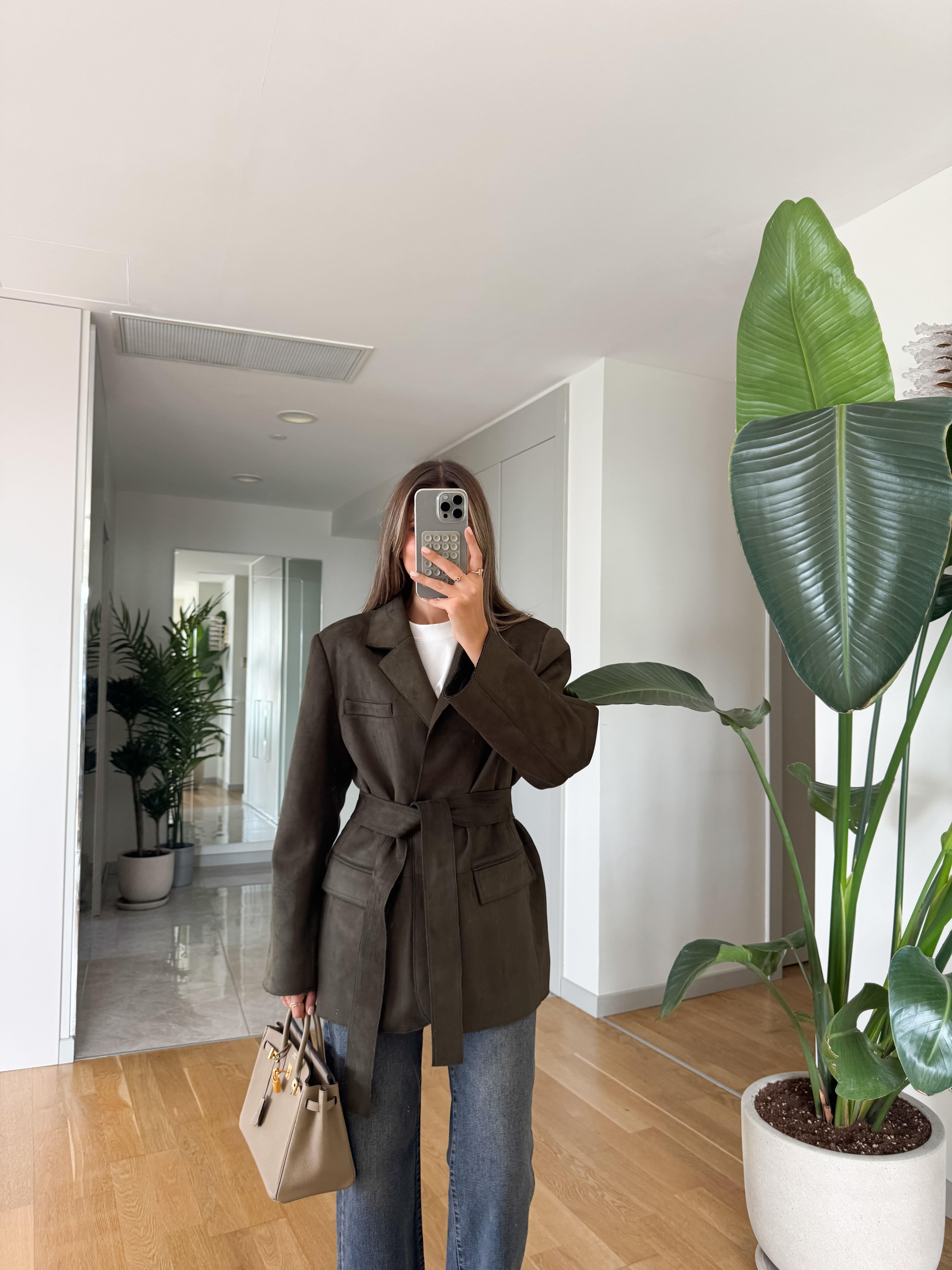 Premium Vatkalı Kuşaklı Nubuk Ceket - Haki