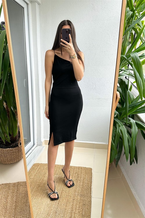 Siyah Asimetrik Yaka Askılı Elbise