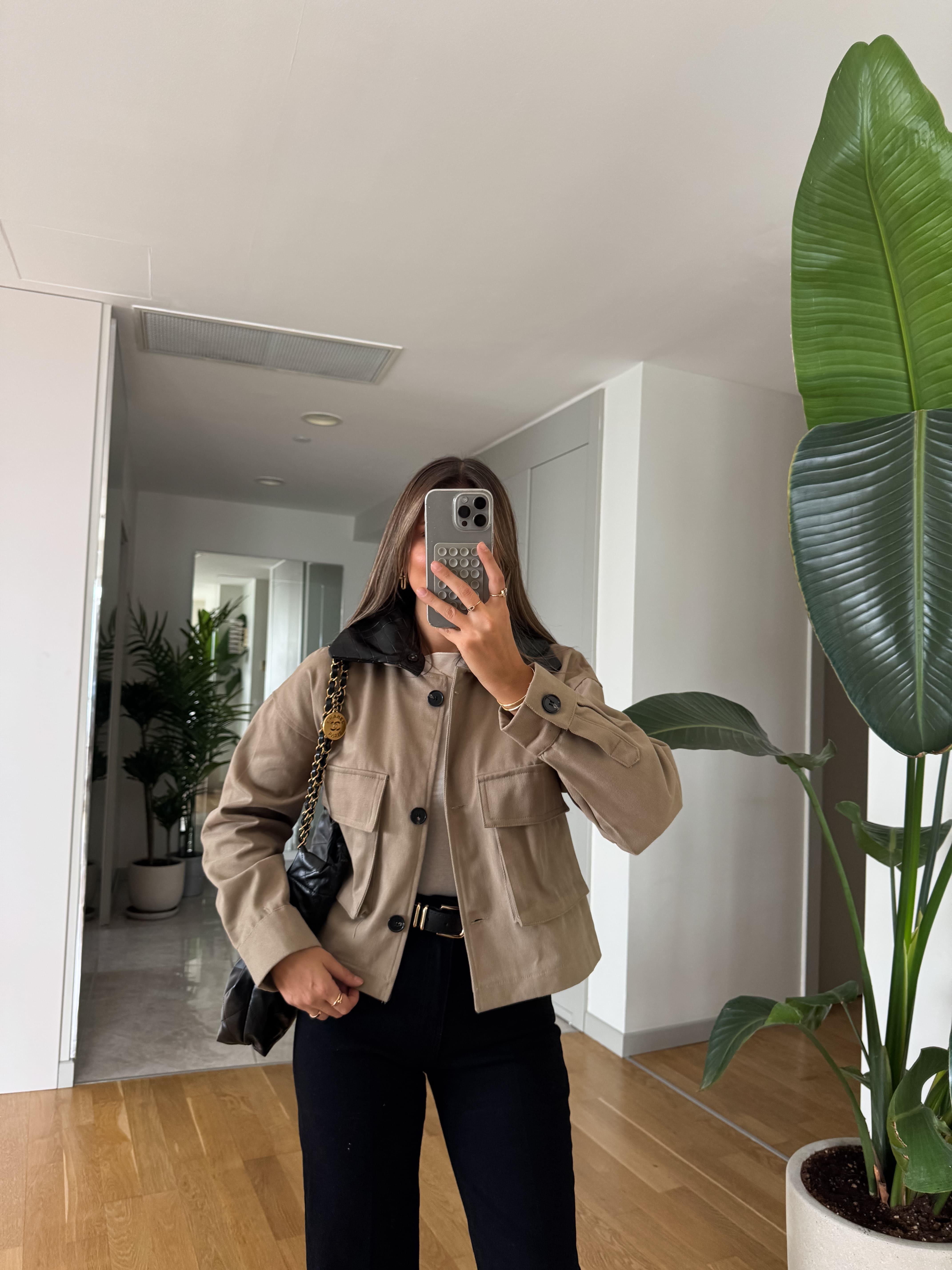 Yakası Deri Detaylı Gabardin Ceket (YKS-DR-DTYL-GBRDN-CKT)
