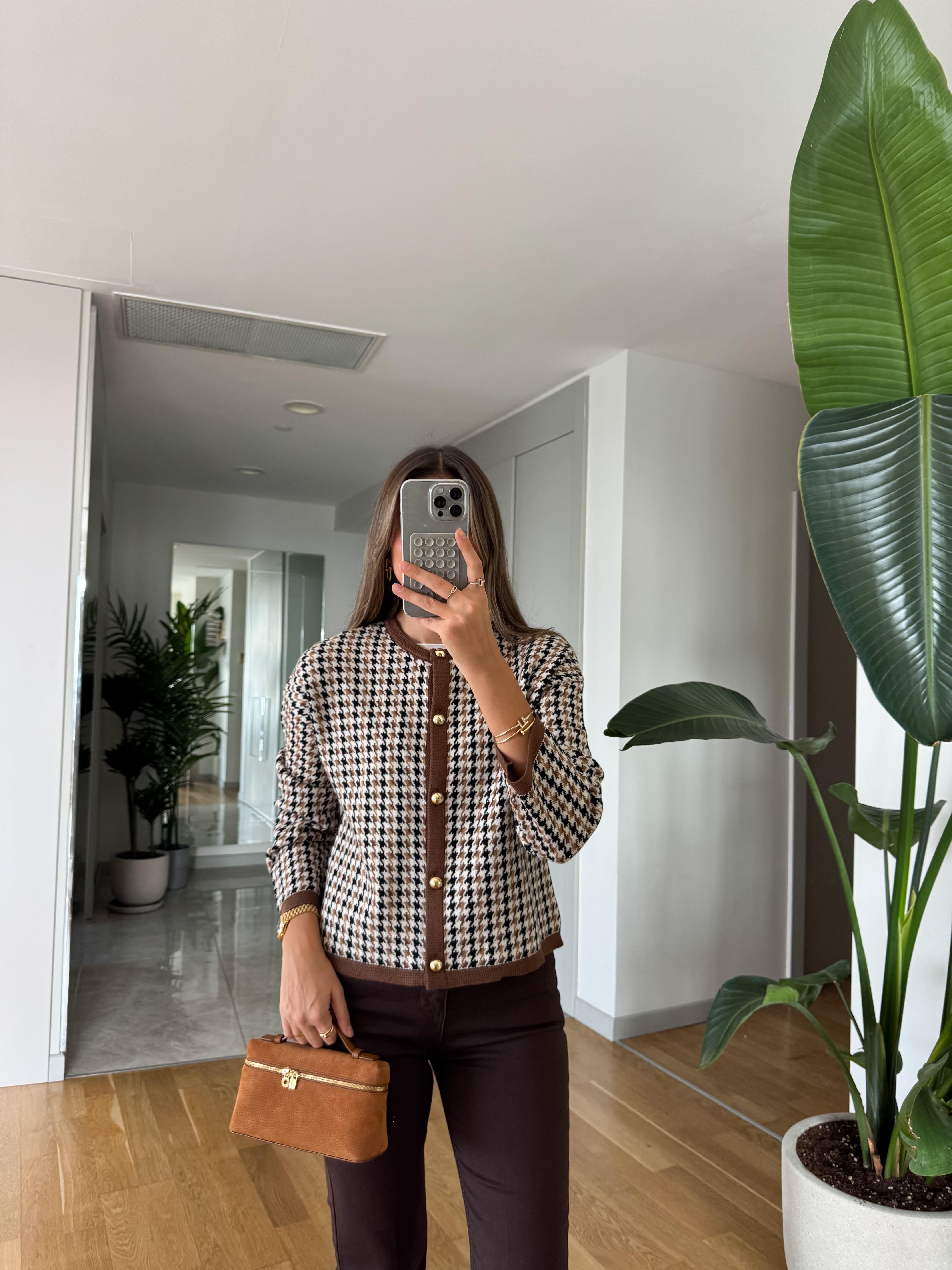 Gold Düğmeli Kazayağı Desenli Hırka (GLD-DGML-KZY-DSNL-HRK)