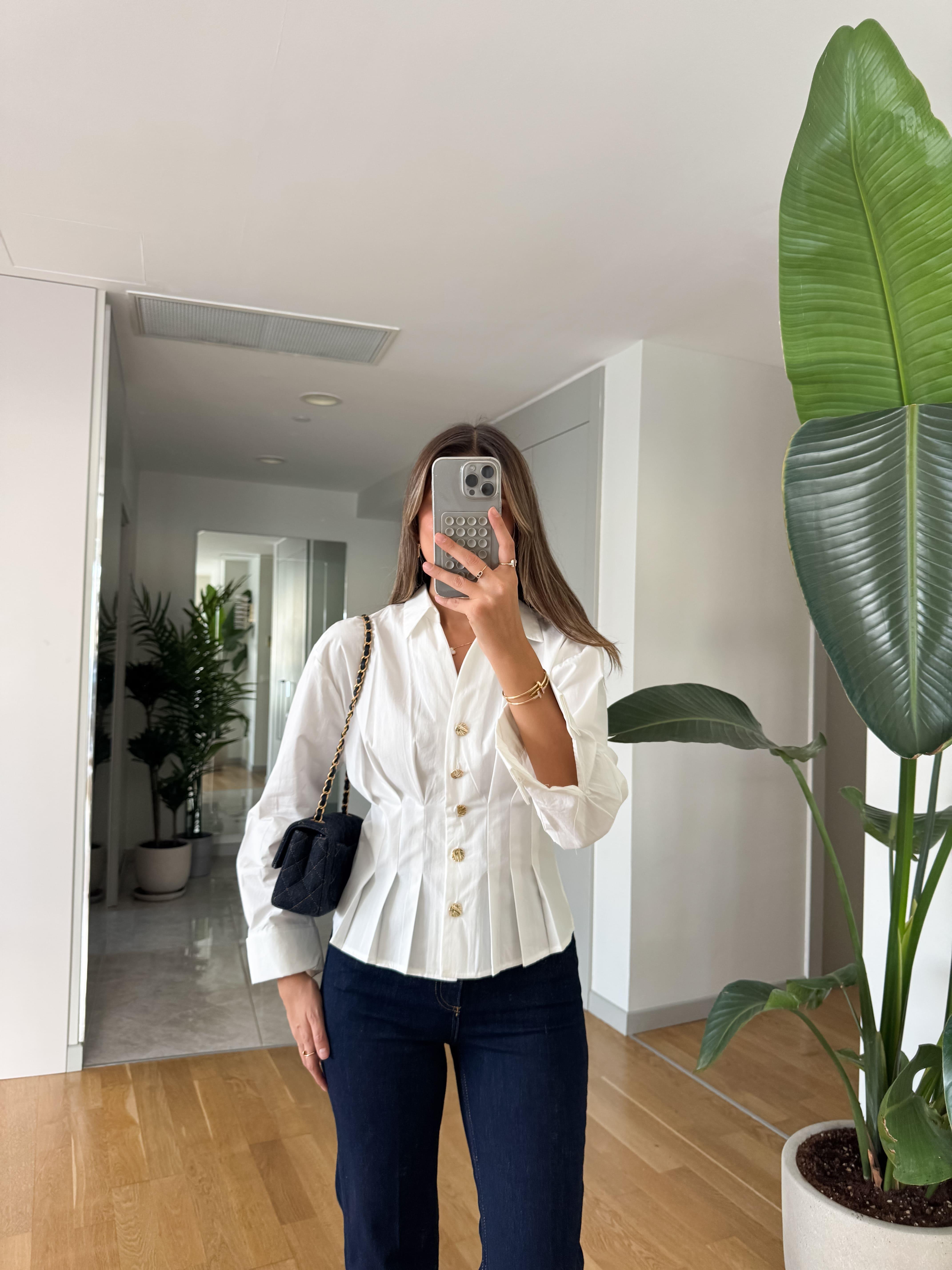 Gold Düğmeli Pileli Gömlek- Beyaz