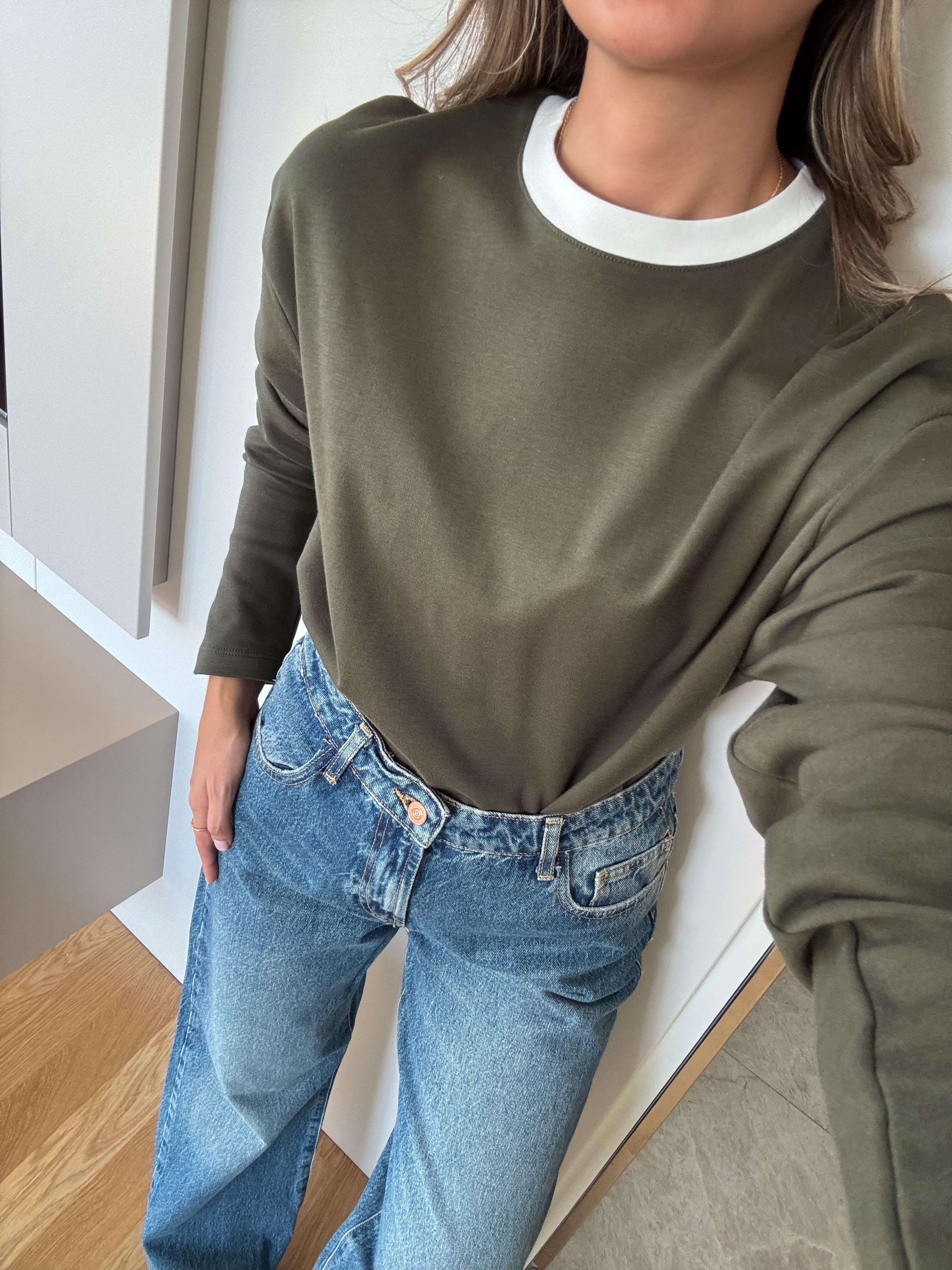 Haki Yakası Ekru Biyeli Pamuklu Bluz