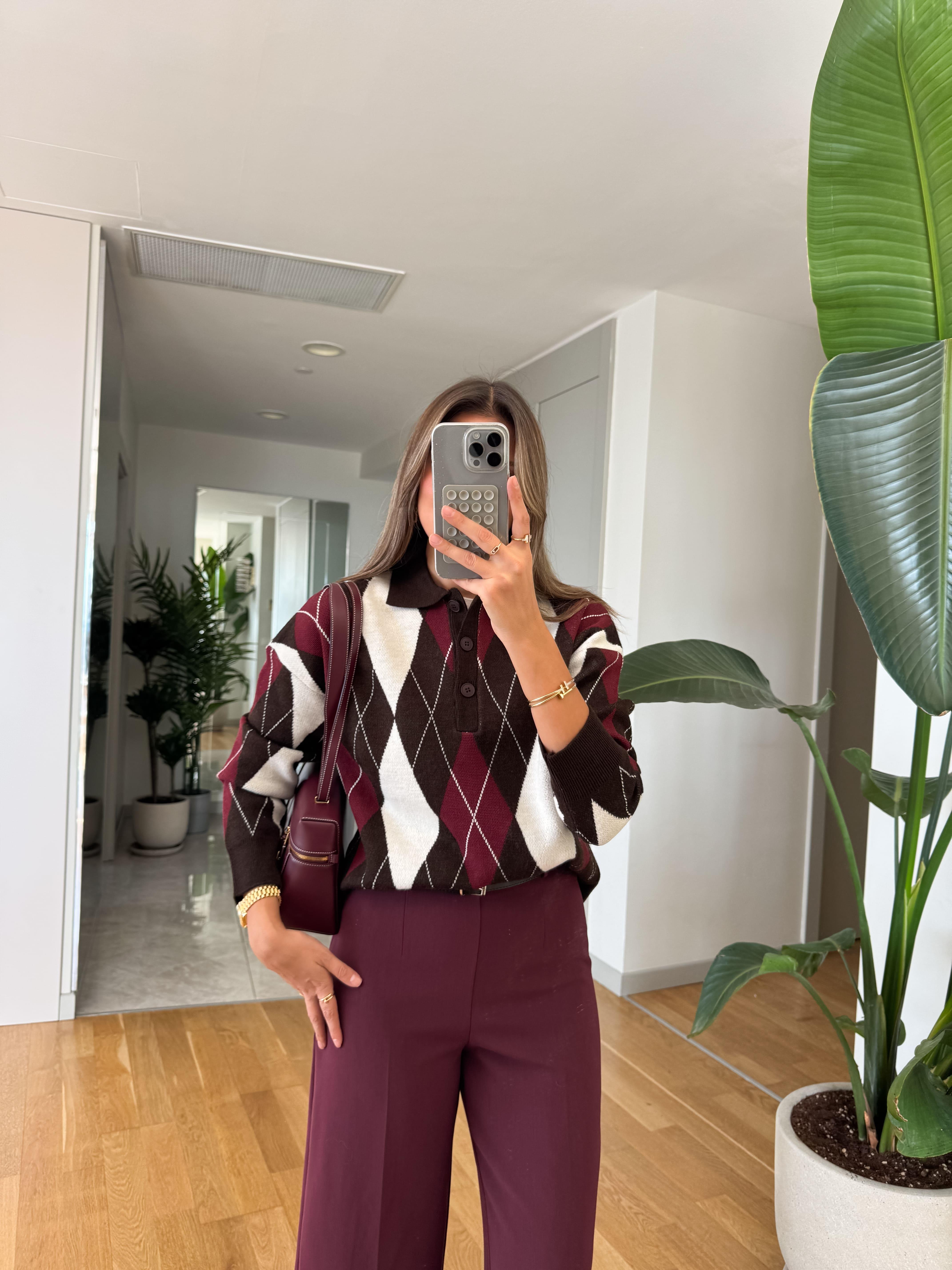 Polo Yaka Baklava Desenli Kazak - Kahve