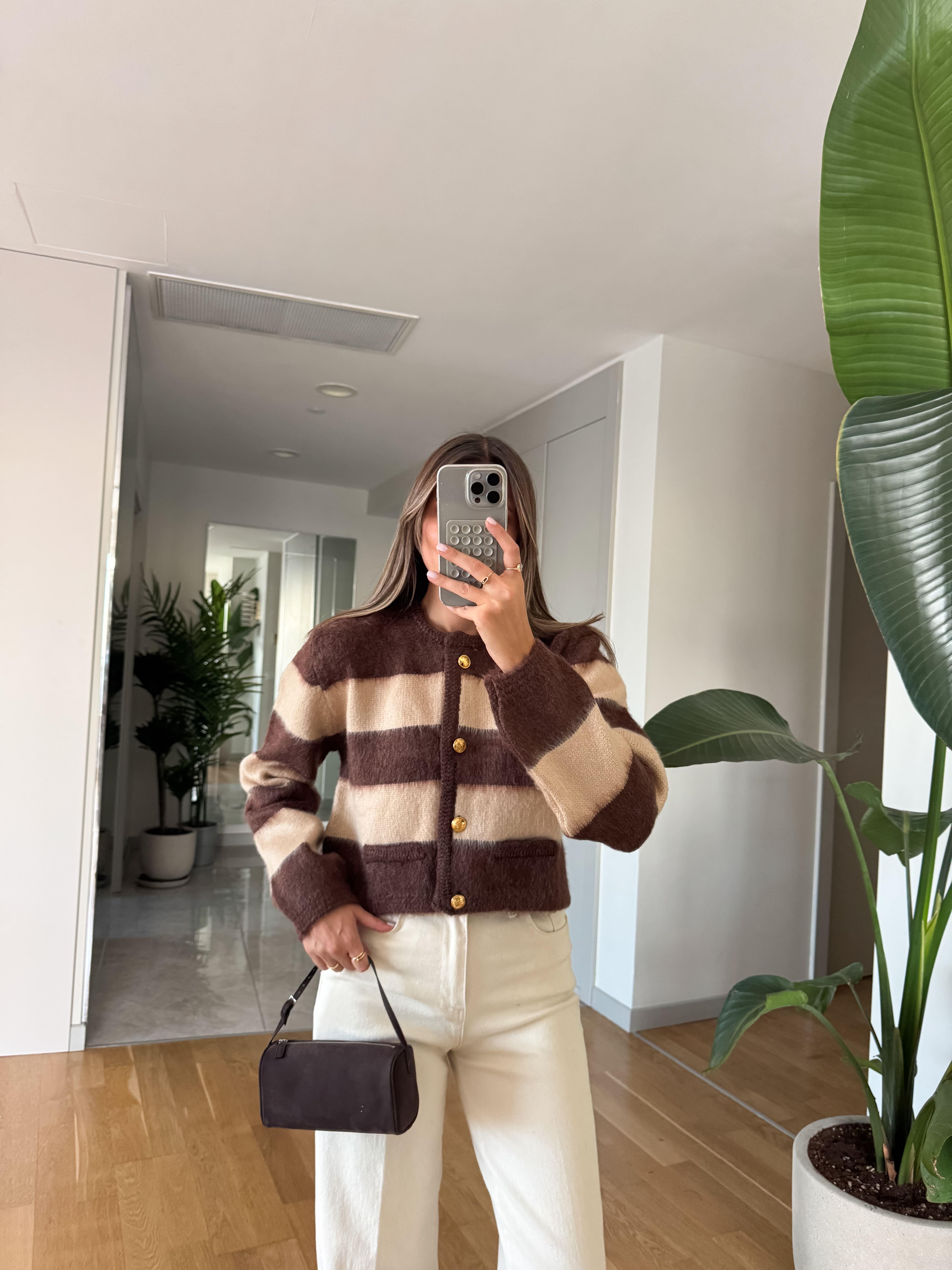 Şardonlu Gold Düğmeli Çizgili Hırka - Kahve