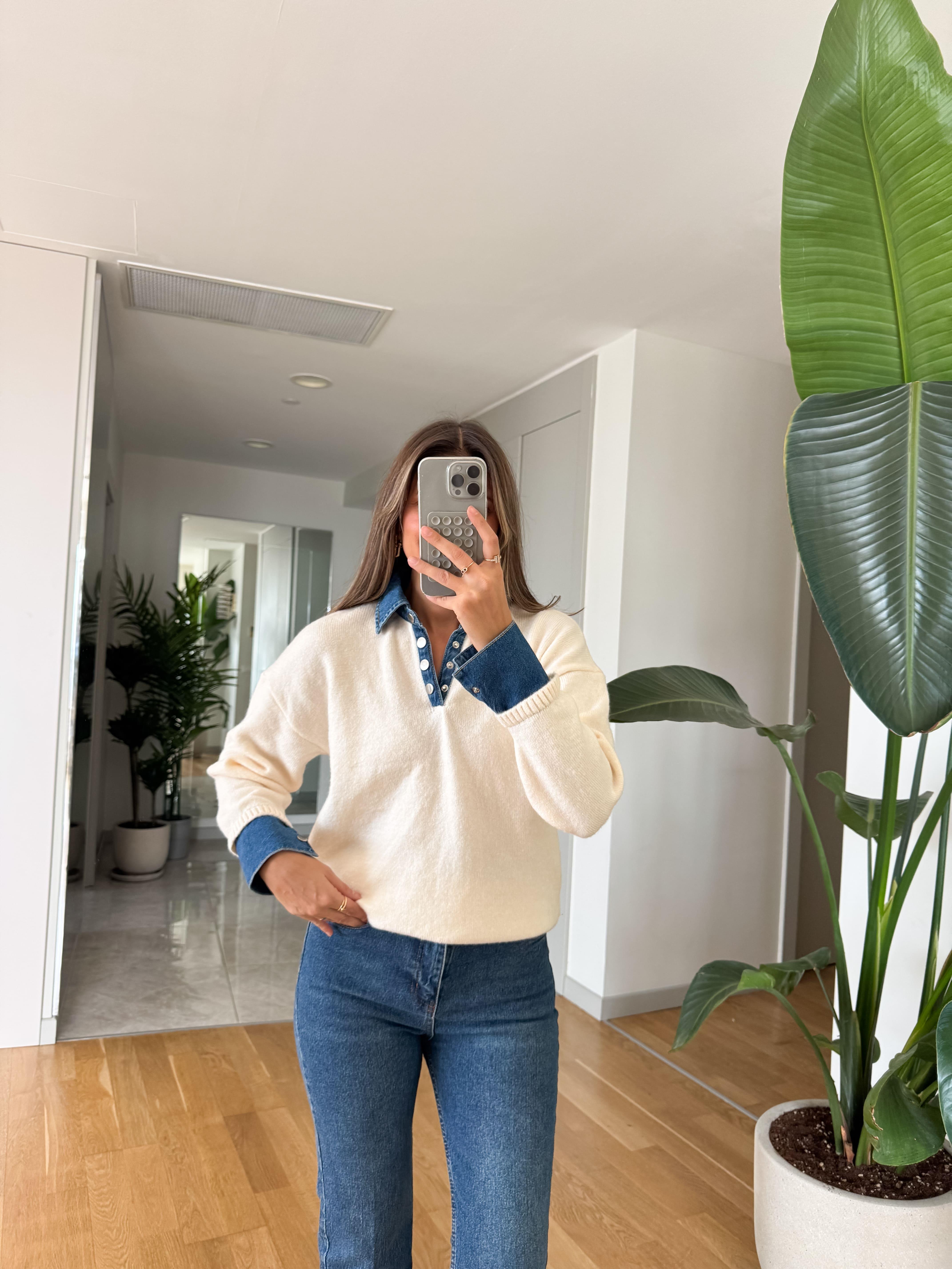 Yakası Denim Detaylı Kazak - Ekru (YKS-DNM-DTYL-KZK-KR)