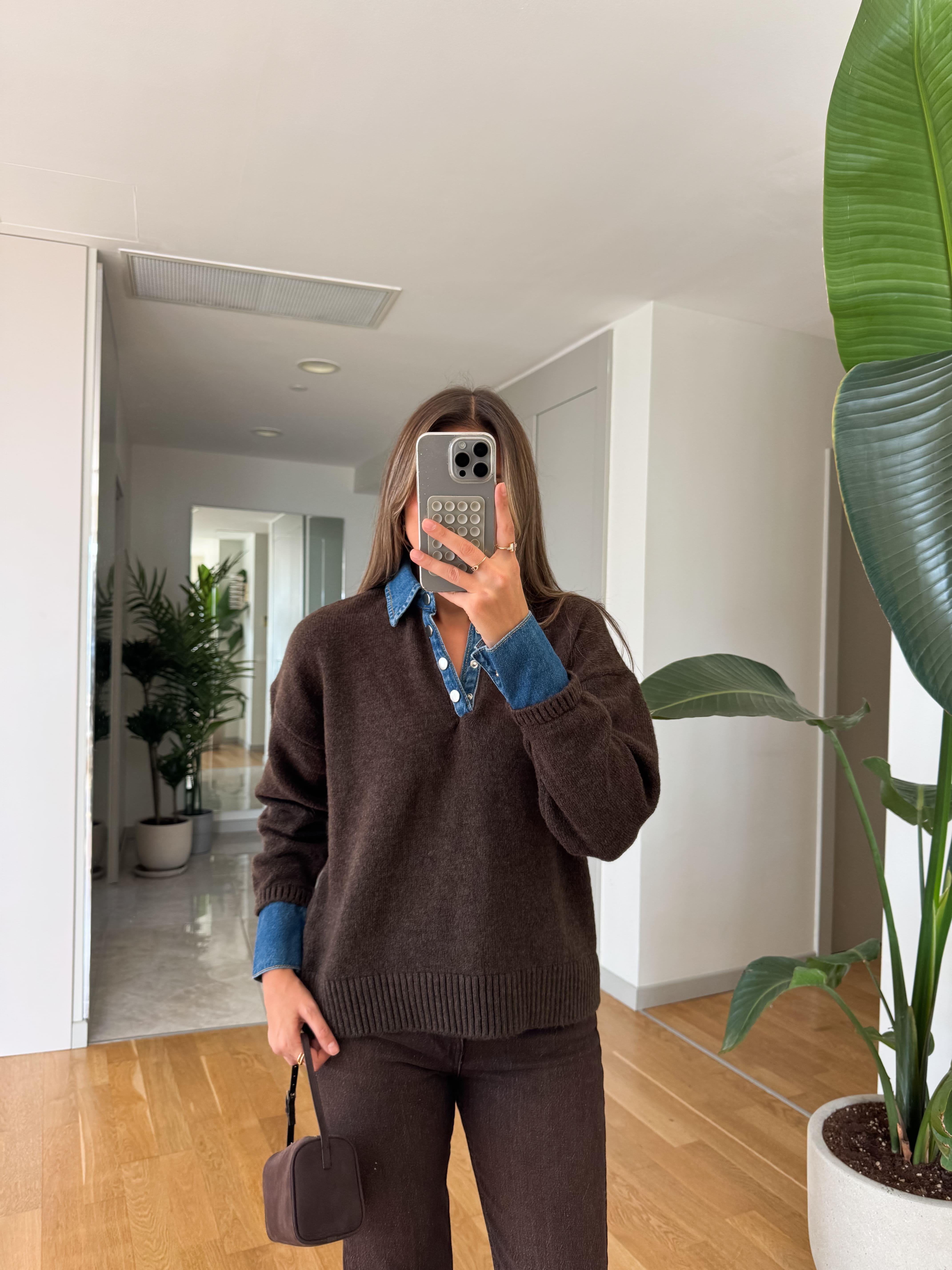 Yakası Denim Detaylı Kazak - Kahve (YKS-DNM-DTYL-KZK-KHV)